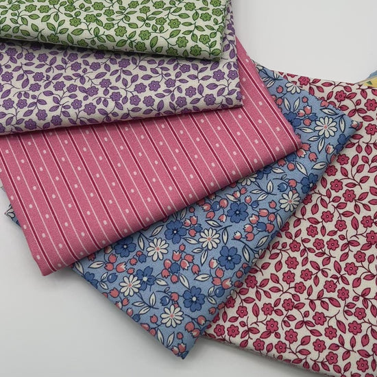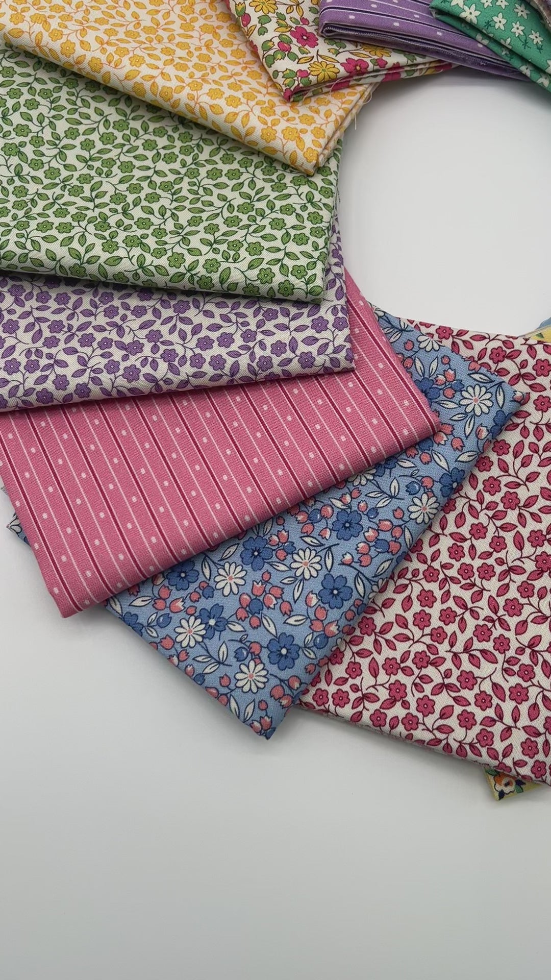 This bundle is Aunt Grace Garden Variety by Judy Rothermel for Marcus and includes 14 Fat Quarters. The fabric selection is exactly as pictured. All fabrics are 100% cotton and quilt shop quality. Each cut of fabric is 18x21 inches.