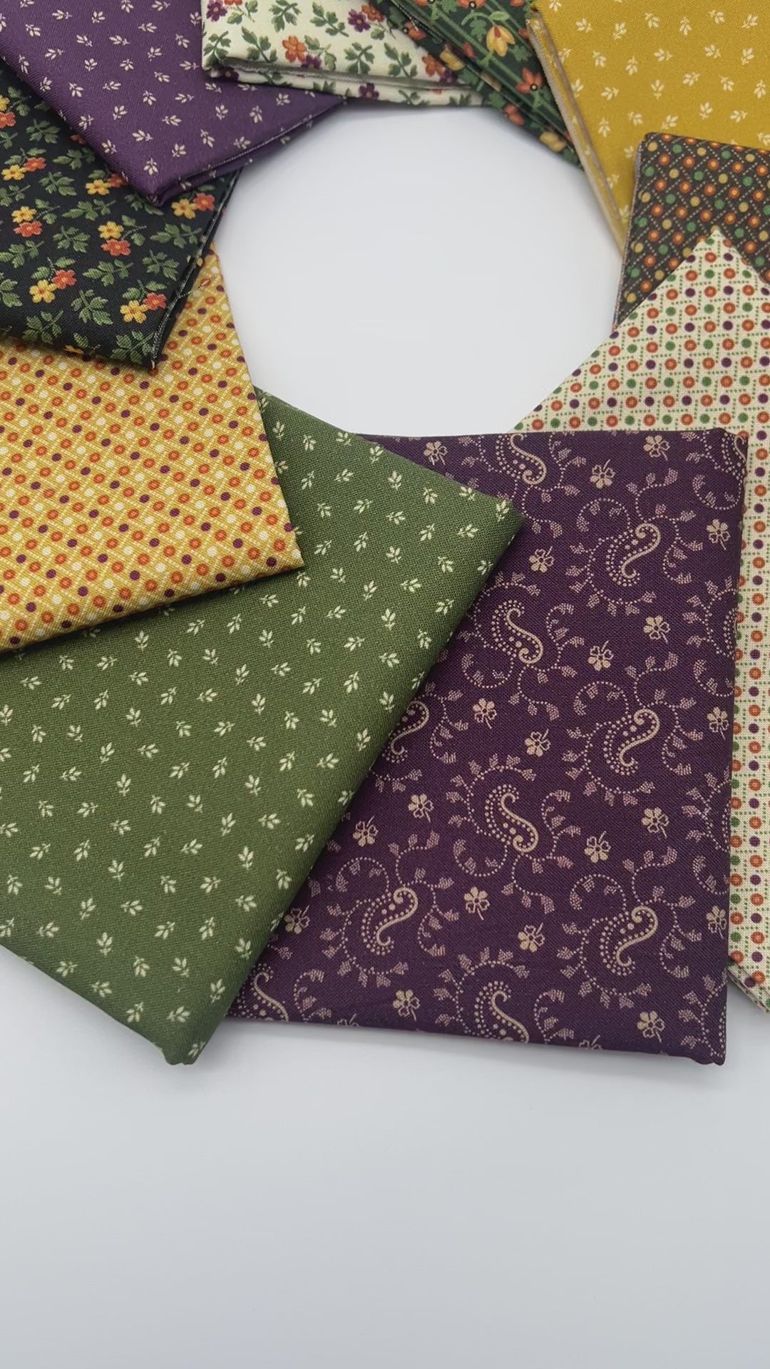 This bundle is Autumn Delight by Katie Solberg and includes 10 Fat Quarters. The fabric selection is exactly as pictured. All fabrics are 100% cotton and quilt shop quality. Each cut of fabric is 18x21 inches.