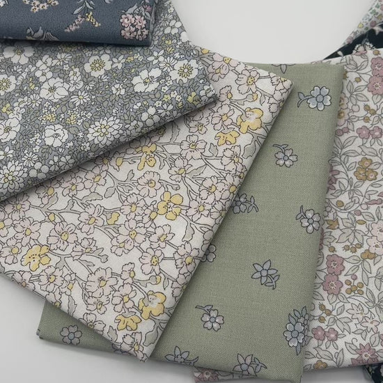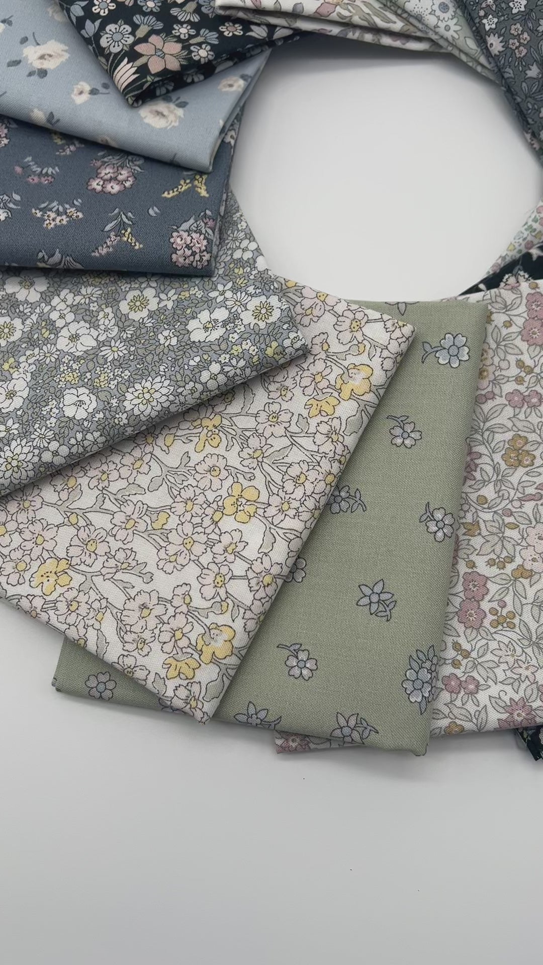 This sweet fat quarter bundle is Flower Show Pebble by Liberty Fabrics for Riley Blake. The Bundle includes 13 Fat Quarters. The fabric selection is exactly as pictured. All fabrics are 100% cotton and quilt shop quality. Each cut of fabric is 18x21 inches.