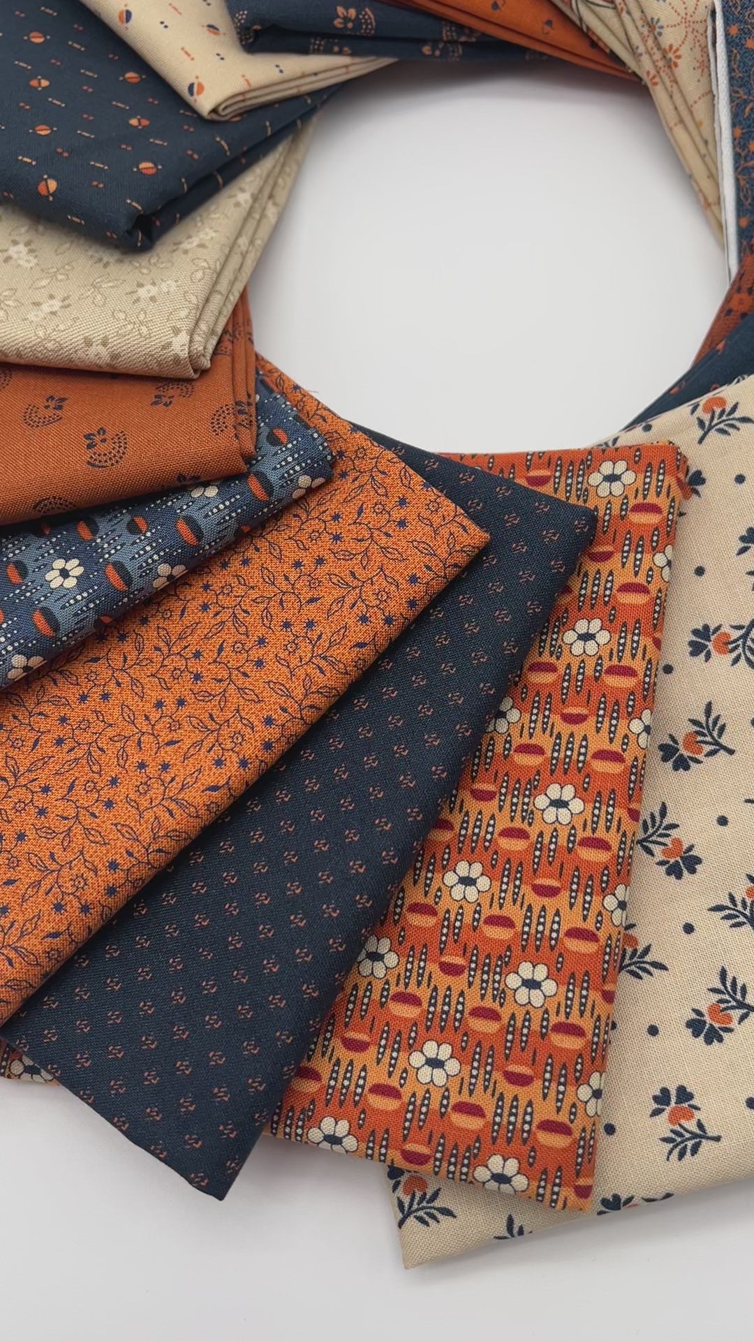 This bundle is Indigo & Cheddar by Judie Rothermel for Marcus Fabrics and includes 16 Fat Quarters. The fabric selection is exactly as pictured. All fabrics are 100% cotton and quilt shop quality. Each cut of fabric is 18x21 inches.